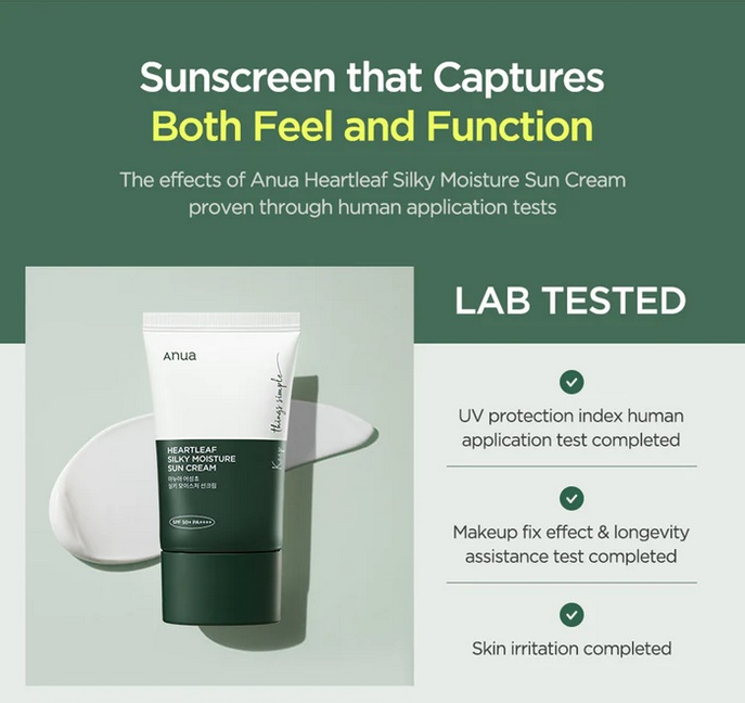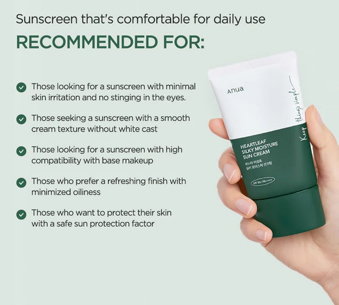 Anua Heartleaf Silky Moisture Sun Cream SPF50+/PA++++ este o cremă facială cu protecție solară completă, care combină hidratarea intensă cu un efect calmant și o senzație de confort absolut. Formula sa lejeră, asemănătoare unui gel, se absoarbe rapid fără a lăsa peliculă albă sau lipicioasă. Perfectă pentru utilizare zilnică, oferă pielii protecție avansată împotriva razelor UVA și UVB, contribuind la prevenirea îmbătrânirii premature.