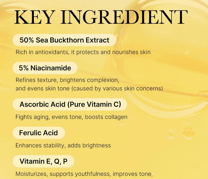 Compozitie: Hippophae Rhamnoides Water, Glycerin, Aqua, Niacinamide, Methylpropanediol, Propanediol, 1,2-Hexanediol, Butylene Glycol, Dipropylene Glycol, Caprylic/Capric Triglyceride, Glycereth-26, Ethylhexyl Palmitate, Cetearyl Alcohol, Arginine, Carbomer, Ammonium Acryloyldimethyltaurate/VP Copolymer, Cetearyl Olivate, Helianthus Annuus (Sunflower) Seed Oil, Sorbitan Olivate, Simethicone, Polyglyceryl-10 Stearate, Ethylhexylglycerin, Adenosine, Perfum, Polyacrylate-13, Glycine Soja (Soybean) Oil, Disodium EDTA, Polyisobutene, Hydrolyzed Sclerotium Gum, Glyceryl Stearate, Gluconolactone, Polysorbate 20, Sorbitan Isostearate, Hydrogenated Lecithin, Bixa Orellana Seed Oil, Polyglyceryl-10 Laurate, Alpha-Arbutin, Panthenol, Sodium Ascorbyl Phosphate, Pentylene Glycol, Ferulic Acid, Tocopherol, Ascorbyl Glucoside, 3-O-Ethyl Ascorbic Acid, Bisabolol , Ascorbic Acid, Hydroxyphenyl Propamidobenzoic Acid, Pyridoxine, Ubiquinone, Biotin, Folic Acid, Sodium Hyaluronate, Ascorbyl Propyl Hyaluronate, Ascorbyl Palmitate, Cyanocobalamin, Thiamine HCl, Riboflavin, Linoleic Acid, Beta-Carotene, Rutin, Hydroxycinnamic Acid