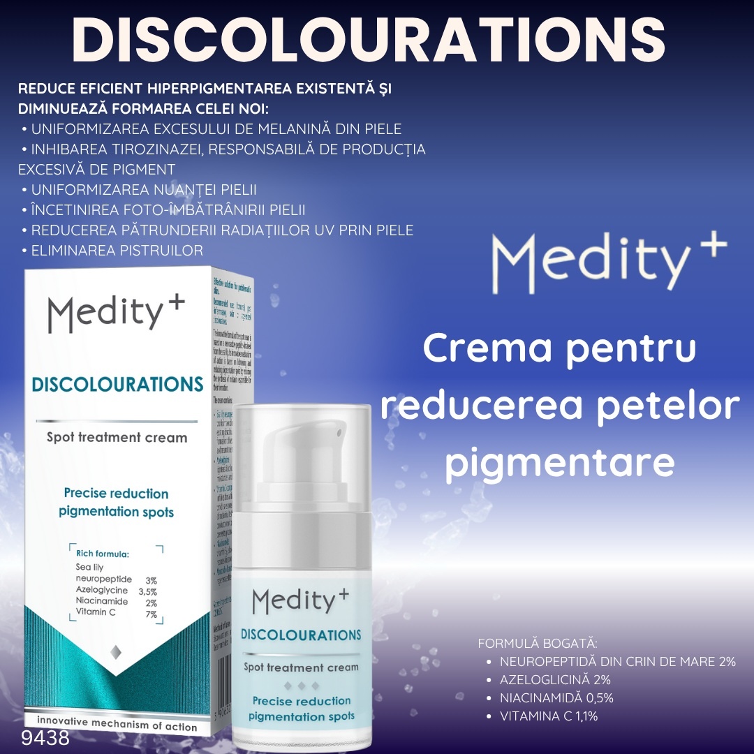 - Formula modernă a cremei pentru reducerea petelor pigmentare Medity+ se bazează pe un neuropeptid neuroactiv izolat din crinul de mare.